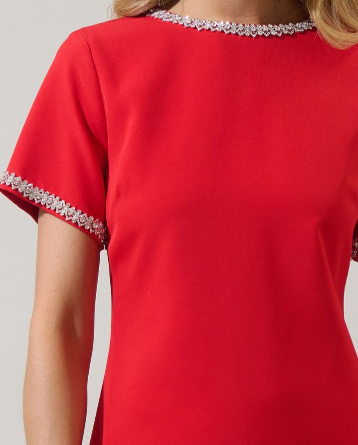 Turn heads effortlessly at your next glamorous event with this sophisticated piece. This mini shift dress features short sleeves, rhinestone trims on the neckline and sleeves, an invisible back zipper, and a sleek, clean A line silhouette. Style with strappy heels, a statement bag, and dazzling earrings to complete your evening ready look.