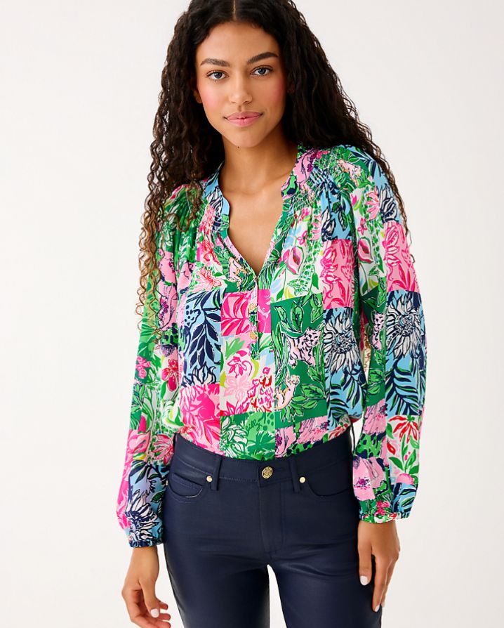• Easy fit, pullover blouse with gold buttons and bracelet-length sleeves.