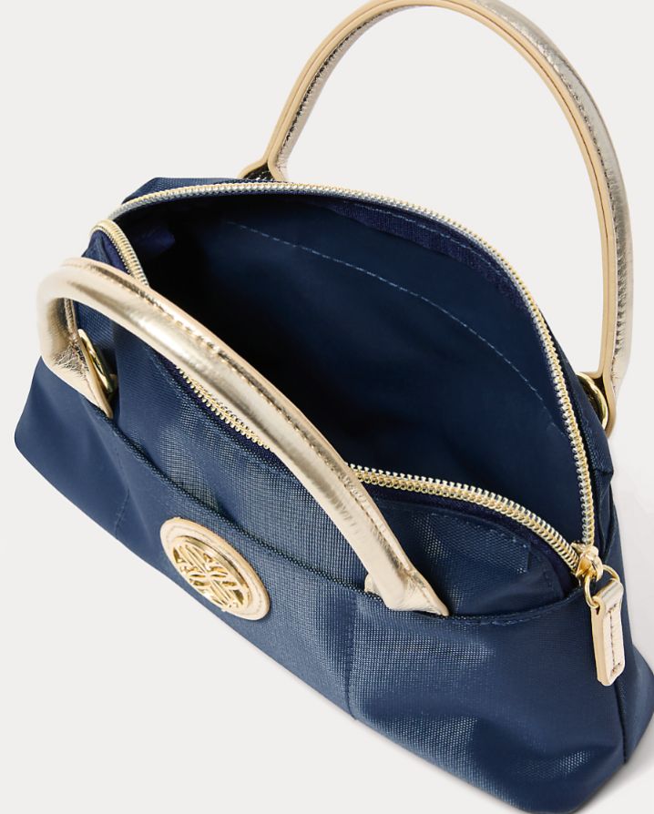 - Nylon top handle mini bag with a front slip pocket, zip top closure, and a detachable logo crossbody strap.