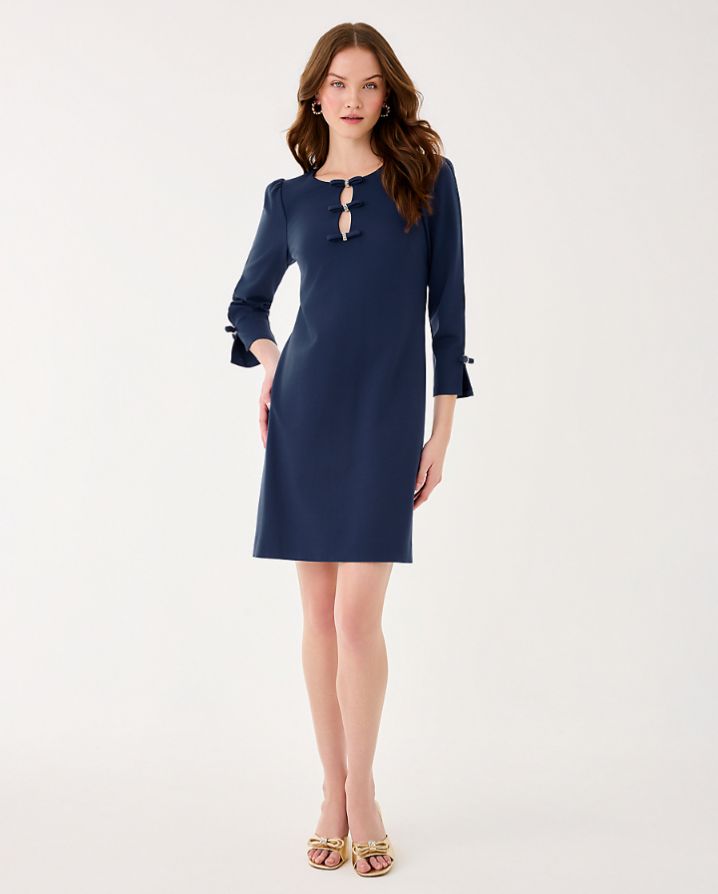 - Straight fit, crew neck shift dress with 3/4 length sleeves and rhinestone bows at the neckline and sleeves.