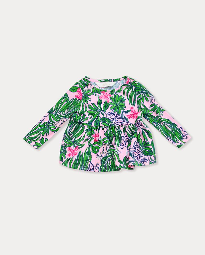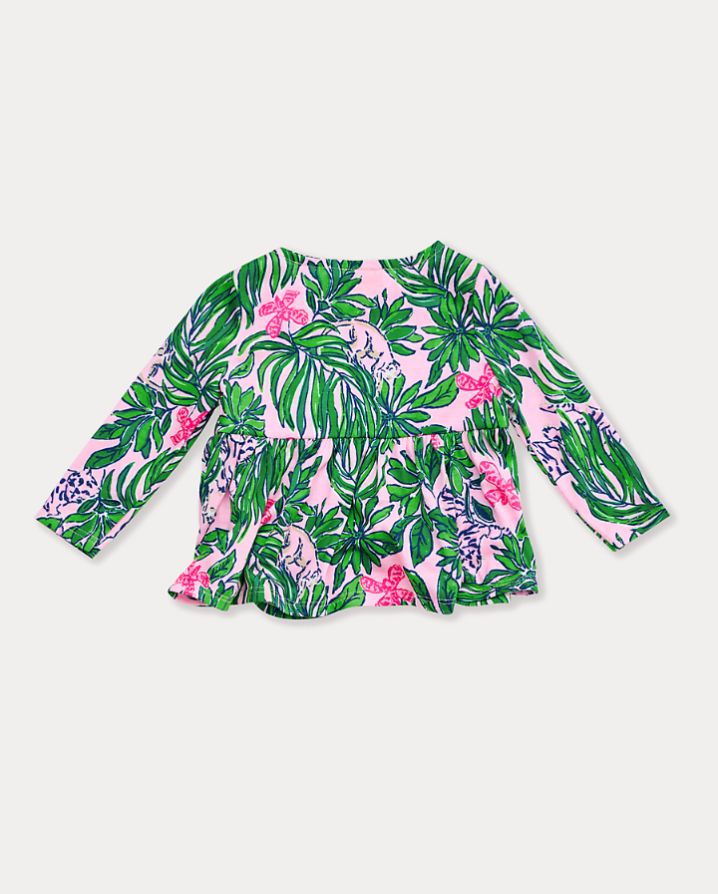 - Easy fit tunic top with long sleeves, a peplum flounce, snap shoulder opening, and a wide neckline. Includes coordinating pull-on leggings with hem bows.