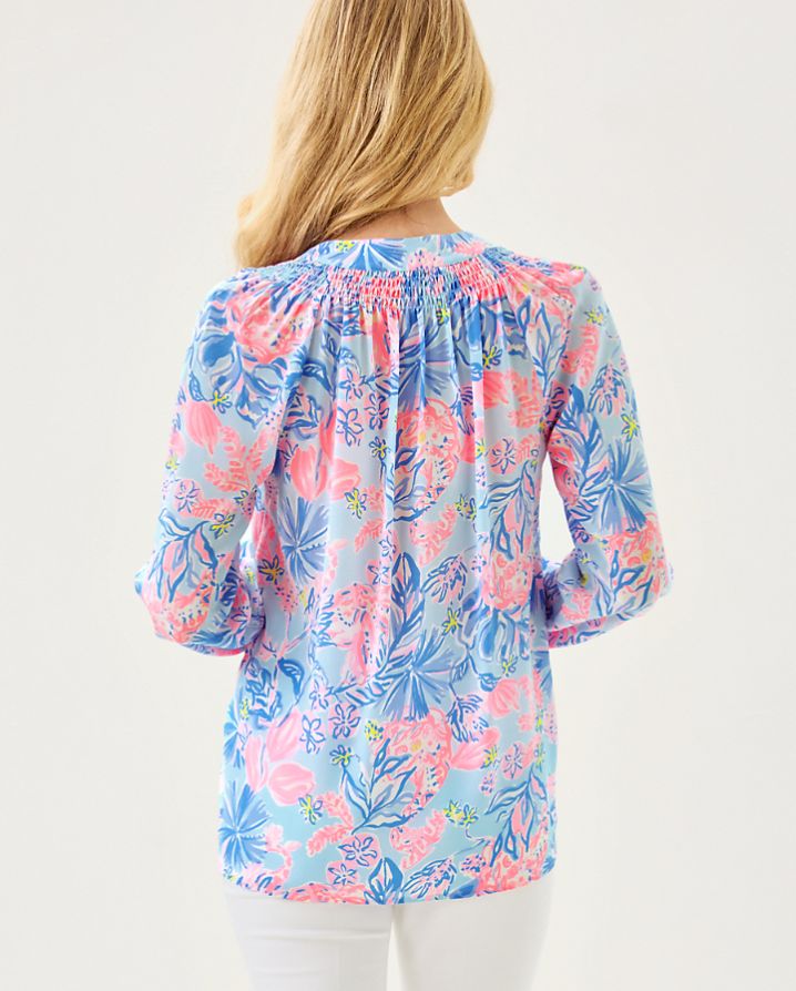 - Easy fit, pullover blouse with gold buttons and bracelet-length sleeves.
